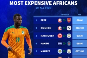 體育資訊7月20日訊 德轉(zhuǎn)網(wǎng)站統(tǒng)計(jì)了非洲球員的最高轉(zhuǎn)會(huì)費(fèi),佩佩從里爾加盟阿森納的8000萬(wàn)歐元居首,具體情況如下: