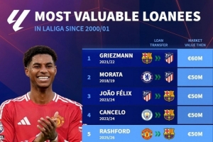 體育資訊7月24日訊 德國轉(zhuǎn)會(huì)市場統(tǒng)計(jì)了本世紀(jì)以來租借加盟西甲俱樂部球員的身價(jià),并列出榜單,格列茲曼6000萬歐居首,拉什福德5000萬歐排名并列第2位。