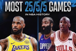 25+5+5場(chǎng)次,詹姆斯716場(chǎng)排名第一,哈登336場(chǎng)排名第二,喬丹319場(chǎng)排名第三。