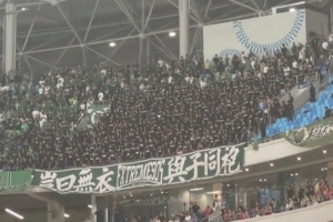 賽后,兩隊球員相互致意期間,看臺一角的國安球迷集體高呼:“丟人現(xiàn)眼!”