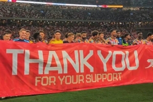 此役在新加坡國(guó)家體育場(chǎng)進(jìn)行,阿森納官方社媒曬出賽后的視頻,槍手球員們拉出橫幅感謝新加坡球迷的支持,并為球迷簽名。