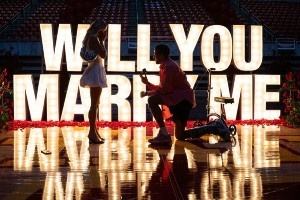 從照片中可以看出,哈利伯頓穿著保護(hù)靴也依舊做出了單膝跪地的求婚動作。另外哈利伯頓的求婚的場地也很特別,是在兩人的母校愛荷華州立大學(xué)的籃球館。