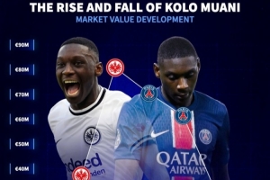 穆阿尼在效力南特時(shí)期身價(jià)不過(guò)1千萬(wàn)歐元。合同到期免簽加盟法蘭克福后,他的表現(xiàn)非常搶眼,打出46場(chǎng)23球14助攻的驚艷數(shù)據(jù),身價(jià)暴漲至8000萬(wàn)歐元。