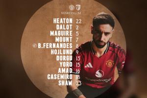 曼聯首發(fā):22-希頓、2-達洛特、5-馬奎爾、15-約羅、23-盧克-肖、13-多古、18-卡塞米羅、7-芒特、8-B費、9-霍伊倫、16-阿瑪德-迪亞洛