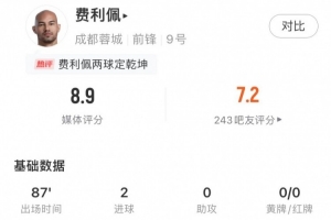 本場比賽,費利佩出場87分鐘,他的5次射門里有2次射正,并且全部形成進球。更為關鍵的是,費利佩在比賽下半時制造了對方門將王大雷的紅牌,這也成為整場比賽的一大轉折點。