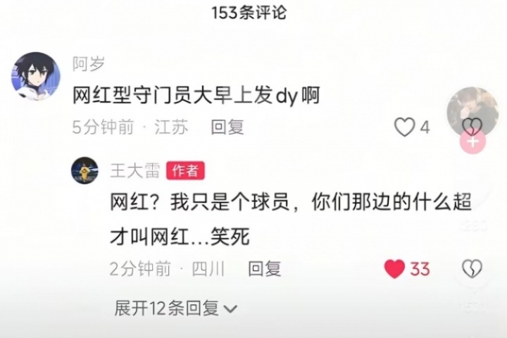 該網(wǎng)友評論:“守門員大早上發(fā)dy啊”。王大雷隨后回復:“網(wǎng)紅?我只是個球員,你們那邊的什么超才叫網(wǎng)紅...笑死”。
