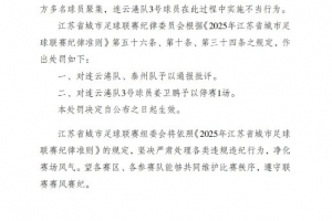 江蘇省城市足球聯(lián)賽官方表示,在連云港隊主場對陣泰州隊的比賽第67分鐘,在裁判員鳴哨停止比賽后,雙方多名球員聚集,連云港隊3號球員在此過程中實施不當行為。