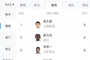 在本輪貢獻(xiàn)1傳1射后,連續(xù)5輪聯(lián)賽送助攻的申花中場高天意的助攻數(shù)來到8個,繼續(xù)領(lǐng)跑助攻榜,奧烏蘇、李源一則以6次助攻并列排在第二位。