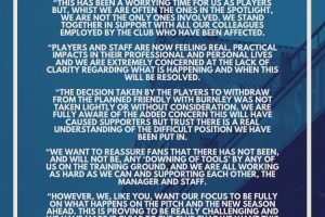球員決定退出原定與伯恩利的友誼賽,并非草率之舉或缺乏考量。我們完全清楚這會(huì)增加球迷的不安情緒,但我們相信,大家能夠理解我們所處的艱難境地。