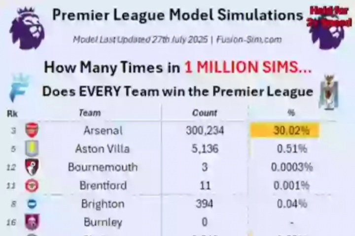 大數(shù)據(jù)網(wǎng)站Fusion Sim對新賽季進行了一百萬次模擬,并統(tǒng)計出各支英超球隊分別奪冠的次數(shù),將其轉(zhuǎn)化為該球隊的奪冠概率。