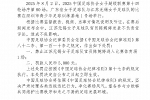 體育資訊8月8日訊 中國(guó)足協(xié)官方消息,對(duì)江蘇女足主教練陳婉婷停賽1場(chǎng)罰款5000元。