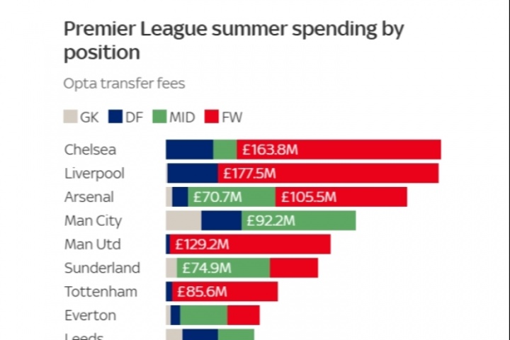 體育資訊08月08日訊 今夏英超聯(lián)賽在轉(zhuǎn)會(huì)市場(chǎng)上投入巨大,天空體育統(tǒng)計(jì)了英超各隊(duì)今夏的轉(zhuǎn)會(huì)支出,并將各隊(duì)支出按位置進(jìn)行分類。