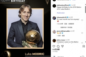 體育資訊8月9日訊 金球獎(jiǎng)官方社媒今日曬照發(fā)文祝2018年獲獎(jiǎng)?wù)吣吕锲嫔湛鞓?lè),但實(shí)際情況是莫德里奇生日為9月9日。