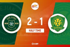 上半場傷停補(bǔ)時(shí)6分鐘,半場結(jié)束,浙江暫2-1北京國安。