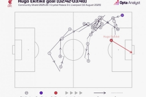 體育資訊8月10日訊 在社區(qū)盾杯決賽利物浦對陣水晶宮的比賽中,?;倏碎_場不到4分鐘破門。