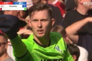水晶宮門將亨德森頭戴鴨舌帽,在點(diǎn)球大戰(zhàn)中兩度撲出利物浦點(diǎn)球,并在撲出麥卡的點(diǎn)球后脫帽禮慶祝。