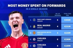 體育資訊8月11日訊 德轉(zhuǎn)統(tǒng)計了單一賽季鋒線引援費用榜單,曼聯(lián)今夏花2.26億歐引進3人排在第三位,巴黎、皇馬前二。