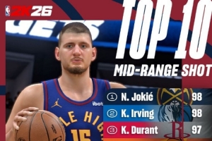 在這次的評(píng)分當(dāng)中,尼科拉-約基奇和凱里-歐文的中距離均為98分,而凱文-杜蘭特的中距離為97分。此外,尼克斯球員邁爾斯-麥克布萊德的中距離為96分。