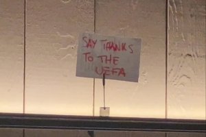 在原本放置烈酒的架子處,貼著一張紙條,解釋了為什么只能賣啤酒。紙條用鮮紅色的字寫著:“感謝歐足聯(lián)”,下面還貼著另一張寫著“這不是我們的錯”。