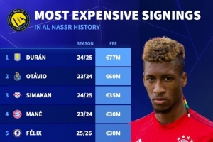 體育資訊8月16日訊 利雅得勝利官方宣布簽下拜仁邊鋒科曼,德國轉(zhuǎn)會市場列出了利雅得勝利隊史最貴引援排名,杜蘭7700萬歐居首,科曼2500萬歐排在并列第7位。