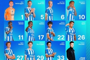 布萊頓首發(fā):1-維爾布魯根、5-鄧克、6-范赫克、10-魯特爾、11-明特、17-巴萊巴、22-三笘薰、26-亞辛-阿亞里、27-韋弗、29-德庫(kù)耶佩、33-馬特-奧萊利