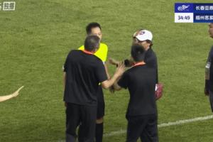 之后長(zhǎng)春亞泰斷球發(fā)起進(jìn)攻,卡米洛完成破門。VAR審核后,主裁判王迪維持進(jìn)球有效。梅州教練組工作人員激動(dòng)向主裁下跪,隨后被人拉起來。
