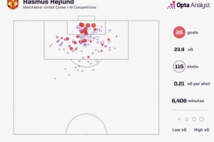 數(shù)據(jù)網(wǎng)站OPTA也盤點(diǎn)了霍伊倫曼聯(lián)生涯射門效率情況,他在各項(xiàng)賽事6406分鐘登場(chǎng)時(shí)間中完成115次射門,打進(jìn)26球,平均每246分鐘打進(jìn)一球。