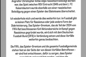 我再次重申,并將繼續(xù)重申——足球界絕不容忍種族主義或任何形式的歧視。作為2024年國際足聯(lián)理事會(huì)通過的五項(xiàng)反種族主義行動(dòng)措施的一部分成立的球員委員會(huì),將與德國足球協(xié)會(huì)聯(lián)系,并持續(xù)密切關(guān)注這些事件。
