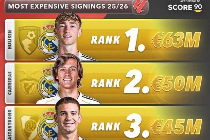 1、赫伊森,伯恩茅斯→皇馬,6300萬歐