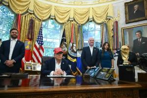 副總統(tǒng)JD-萬(wàn)斯(左一)、國(guó)際足聯(lián)主席詹尼-因凡蒂諾(右二)及國(guó)土安全部長(zhǎng)克里斯蒂-諾姆(右一)共同見證此次公告。