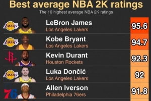 體育資訊8月23日訊 今日美媒HoopsHype曬出NBA球員2K歷史平均評(píng)分最高的10位球員,具體如下: