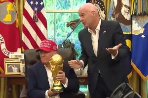 因凡蒂諾拿著大力神杯對特朗普說道:“這個獎杯只屬于贏家,你是勝者,當然你可以摸摸它。這很重,上一位捧起這座獎杯的人是梅西,現(xiàn)在獎杯就在這里?!?/p>