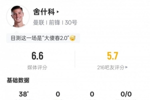 體育資訊8月25日訊 2025-26賽季英超第2輪,曼聯(lián)客場1-1富勒姆。舍什科替補出戰(zhàn),多項數(shù)據(jù)掛零,只有2次爭頂均成功。