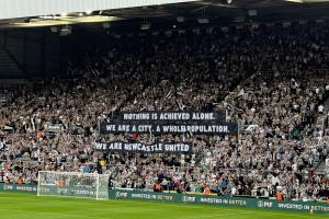 圣詹姆斯公園球場(chǎng)開(kāi)賽初段,紐卡球迷通過(guò)展示橫幅營(yíng)造出充滿敵意卻又熱烈的氛圍。橫幅上書(shū):“偉業(yè)非一人可成,我們是一座城,是全體居民,我們是紐卡斯?fàn)柭?lián)?!?/p>