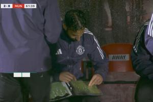 體育資訊08月28日訊 聯(lián)賽杯曼聯(lián)vs格林斯比,第62分鐘鏡頭給到場邊,阿莫林在場邊拿著戰(zhàn)術(shù)板。