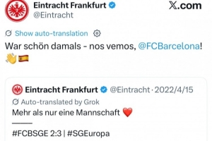 在抽簽出爐后,法蘭克福官推轉(zhuǎn)發(fā)了22年4月,球隊(duì)在歐聯(lián)杯1/4決賽次回合客場3-2擊敗巴薩晉級(jí)下一輪的賽后球隊(duì)合影慶祝勝利的社媒,并配文寫道:“那是一段美妙的經(jīng)歷,期待我們的再次相見,巴薩!”