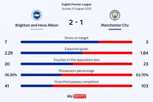 體育資訊08月31日訊 英超第3輪,曼城1-2遭布萊頓逆轉(zhuǎn),藍(lán)月亮新賽季開賽3輪1勝2負(fù)僅積3分。