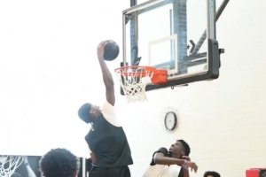 視頻中可以看到,亞歷山大正在和小球員單挑,只見亞歷山大一套連招后使出自拋?zhàn)钥?,引得全場歡呼。