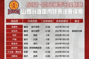 體育資訊9月1日訊 今天,山西男籃官方宣布了新賽季的國內球員注冊信息,原文如下: