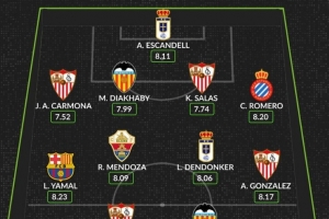 體育資訊9月1日訊 本輪西甲戰(zhàn)罷,數(shù)據(jù)網(wǎng)站W(wǎng)hoscored也評(píng)出本輪西甲最佳陣,其中亞馬爾領(lǐng)銜入選,具體如下: