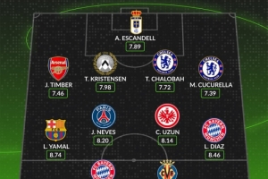 后衛(wèi):廷伯(阿森納,7.46分)、T-克里斯滕森(烏迪內(nèi)斯,7.18分)、查洛巴(切爾西,7.72分)、庫(kù)庫(kù)雷利亞(切爾西,7.39分)