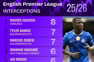 體育資訊9月3日訊 數(shù)據(jù)機(jī)構(gòu)squakwa統(tǒng)計(jì)了新賽季英超球員攔截情況,凱塞多位列榜首。
