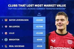 體育資訊9月5日訊 2025年五大聯(lián)賽的夏窗已經(jīng)落下帷幕,德國轉(zhuǎn)會市場統(tǒng)計(jì)了在夏窗過后,全隊(duì)身價跌幅最多的球隊(duì)排行榜。