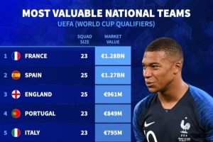 體育資訊9月6日訊 世歐預(yù)正在進(jìn)行中,《轉(zhuǎn)會市場》也統(tǒng)計(jì)了本期歐洲國家隊(duì)陣容身價情況,法國力壓西班牙居首。