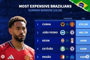 體育資訊9月8日訊 今夏主流聯(lián)賽轉(zhuǎn)會窗已經(jīng)關(guān)閉,《轉(zhuǎn)會市場》也列出了巴西球員的今夏轉(zhuǎn)會費最貴情況。