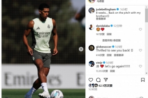貝林厄姆社媒曬出訓(xùn)練照片,配文:“(缺席)8周,終于回到球場與我的兄弟們在一起。”
