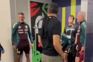 李剛?cè)蚀艘蹫轫n國隊首發(fā)出戰(zhàn),并送出助攻,賽后他與墨西哥主帥阿吉雷相見,兩人寒暄并開玩笑。