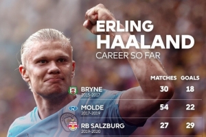 哈蘭德職業(yè)生涯至今進(jìn)球分布: