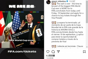 體育資訊9月11日訊 國(guó)際足聯(lián)主席因凡蒂諾更新社媒動(dòng)態(tài),宣布世界杯球票銷售即將開(kāi)始。