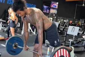 畫面中,杰倫-格林單腳支撐如“金雞獨立”,雙手穩(wěn)穩(wěn)提舉杠鈴,展現(xiàn)出極強(qiáng)的力量與平衡能力。